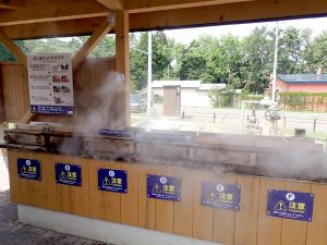 食堂の食事もすごくおすすめなのですが、もうひとつ、ここならではのおすすめグルメがあります。それは温泉蒸し釜を使った料理です。温泉の蒸気を利用した釜で、自分で食材を蒸して食べることができます。物産館で好きな食材を購入し、蒸し釜の上のセイロに食材を入れて蓋をして、あとはタイマーが鳴るのを待つだけという簡単調理です。
