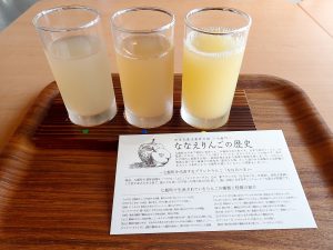 物販コーナーも充実。七飯町は『日本で最初に西洋リンゴが栽培された土地』ということで、リンゴ製品がたくさん並んでいました。リンゴジュースに、リンゴのお菓子やスイーツ、リンゴのドレッシングや、リンゴカレーなんかも! フードコートでは“ききりんご”が頼めます。七飯産のリンゴジュースを3種類飲み比べ。リンゴジュースの飲み比べをすることってほとんどないから、味の違いを楽しめて面白かったです。