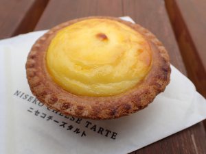 直売所の隣にはテイクアウトコーナー。5店舗が並んでいて、ニセコチーズタルトやコロッケなどニセコ産の食材を使った軽食や、ニセコにあるソーセージ工房の直営店ではホットドックやソーセージがテイクアウトできます。サクサクのタルト生地と、濃厚なチーズクリームのチーズタルトは、私おすすめの一品です。